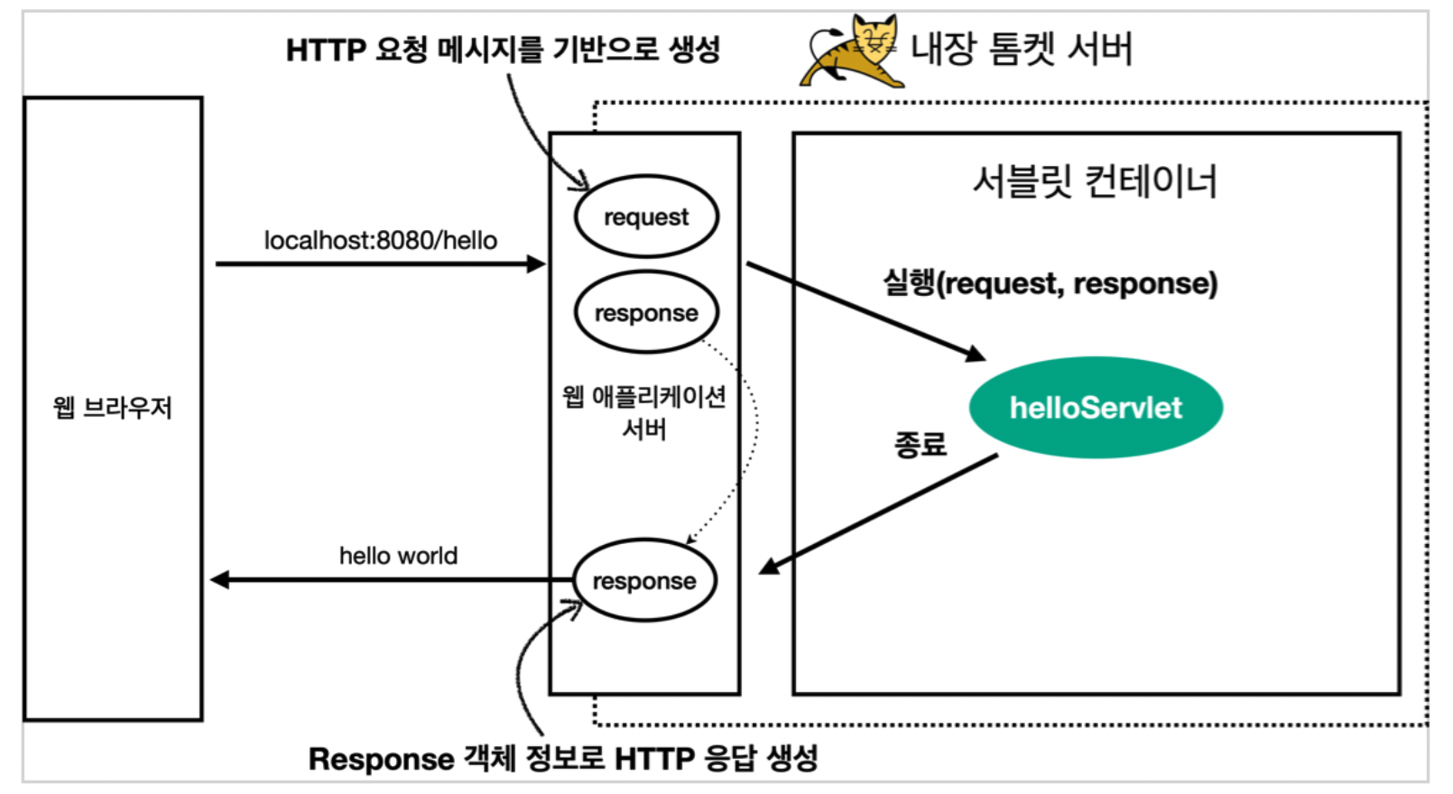 요청이 들어오면 request, response 객체를 만들어서 싱글턴으로 떠 있는 helloServlet을