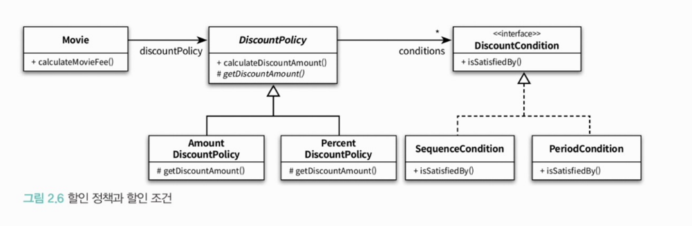 - AmountDiscountPolicy, PercentDiscountPolicy는 “조건을 만족하면 할인 계산을 한다”라는 공통된 개념을 가진다.