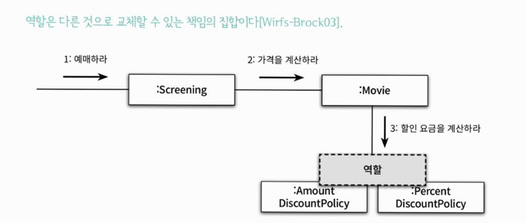 - 역할은 공통의 책임을 바탕으로 객체의 종류를 숨기기 때문에, 이런 관점에서 역할을 객체의 추상화로 볼 수 있다.