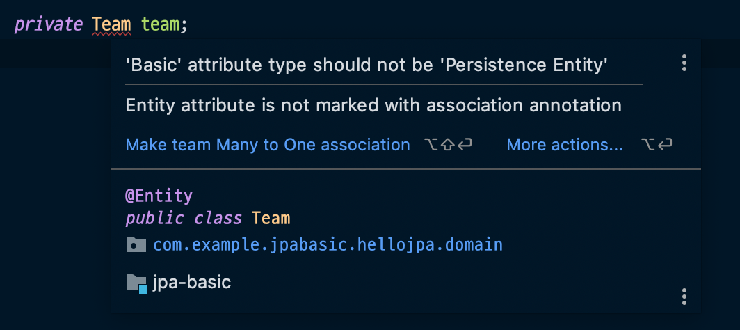 Member 엔티티를 보면 현재 Team을 참조하고 있다. 하나의 팀에는 여러 명의 Member가
